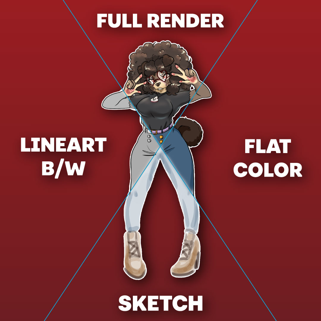 Un boceto de cuerpo completo, diseñado para capturar toda la silueta, postura y esencia del personaje. Es la mejor opción para concepts generales, diseños preliminares o simplemente disfrutar de un estilo dinámico y expresivo.